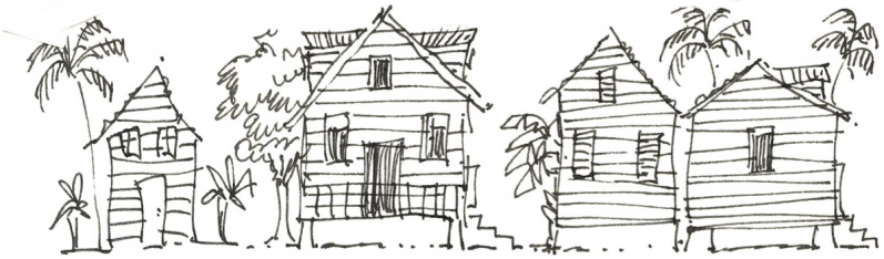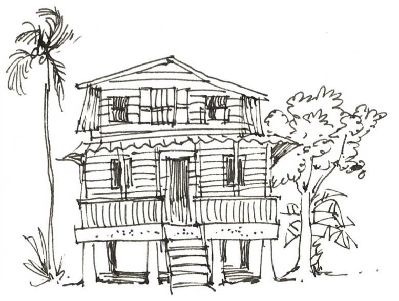 We wonen op een hoek, vlakbij het voetbalstadion. Ons huis, het huis van opa ligt aan een zandweg, het staat op neuten (palen), heeft een ondererf en aan weerszijden een ruim balkon. Aan tweekanten wordt het begrensd door een sloot. Net als alle andere woningen in de buurt is het huis van hout en geverfd in pastelkleuren. Oom woont onder, op het erf, in een later bijgebouwd huis. Omdat het niet zo groot is, slapen zijn kinderen in het bovenhuis.”