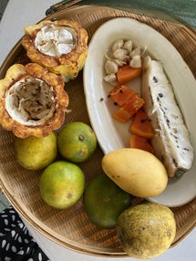 Een schaal vol vers geplukt 'boomrijp'fruit wacht op ons bij aankomst. Dit rit van 4 uur was weer overweldigend. De jungle, de rijstvelden, de vele fruitbomen, de gastvrijheid en het lekkere eten maken Suriname voor mij uniek.