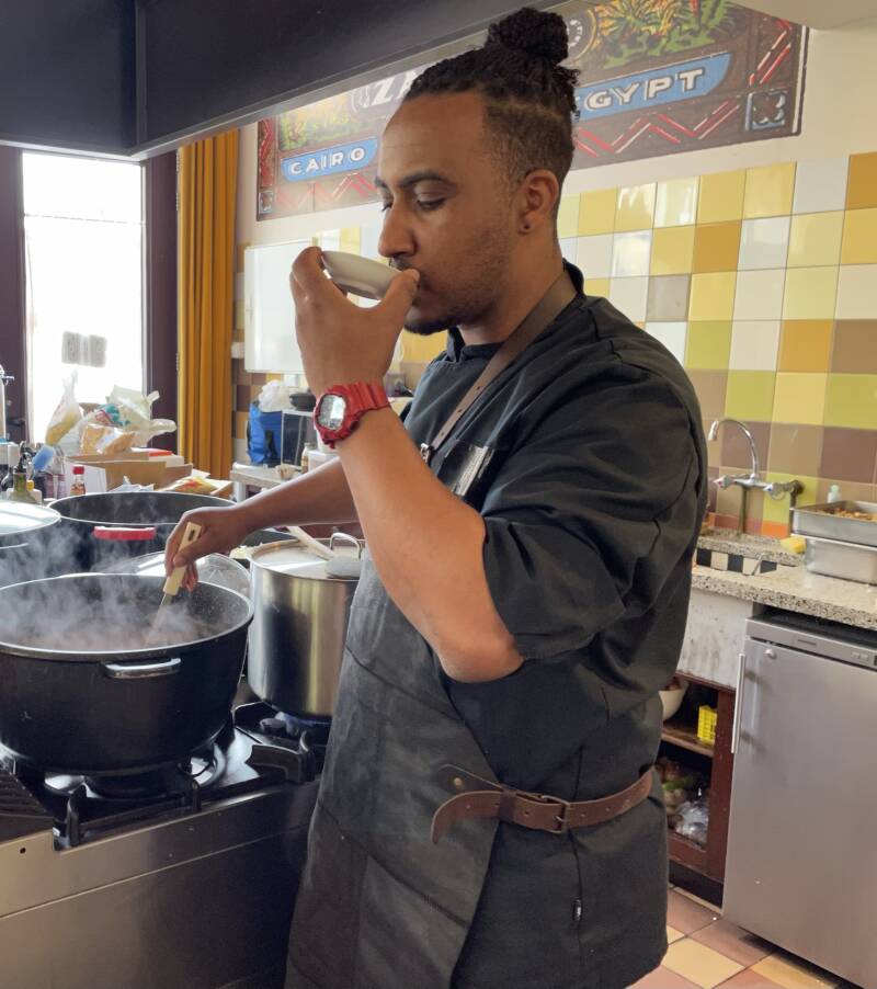 Kok Bryan proef de pindasoep en brengt het op smaak