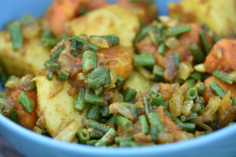 - Voeg gekookte (zoete) aardappels of rauw in blokjes aardappels toe.