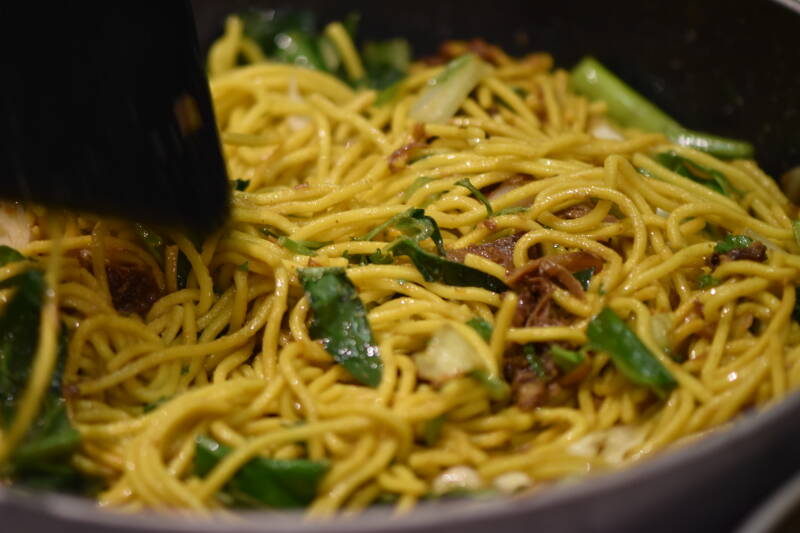 - Bak de gekookte mie door het wokgerecht.