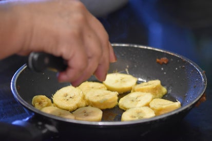 - Bak de stukjes banaan bruin en leg ze op het bord met een stukje huishoudrol.